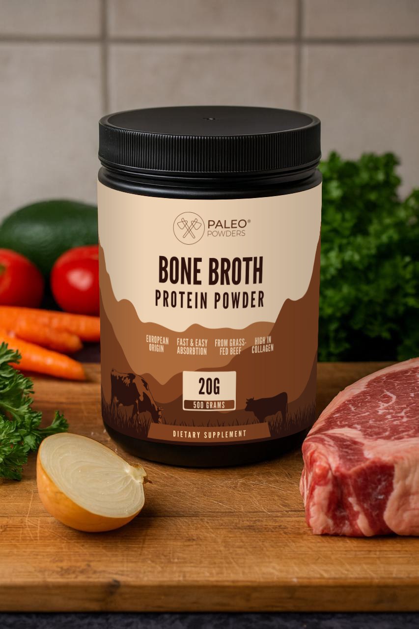 Knochenbrühe, auch bekannt als Bone Broth, ist eine traditionelle und jahrhundertealte Suppe, die durch das Kochen von tierischen Knochen und Knorpel in Wasser hergestellt wird. Unser Knochenbrühepulver wird ausschließlich aus fleischigen Rinderknochen mit Knochenmark gewonnen, die von europäischen, grasgefütterten Rindern stammen. Durch das Trocknen der Knochenbrühe zu Pulver entsteht ein konzentriertes und äußerst nährstoffreiches Produkt mit feiner Struktur und reich an Kollagen.